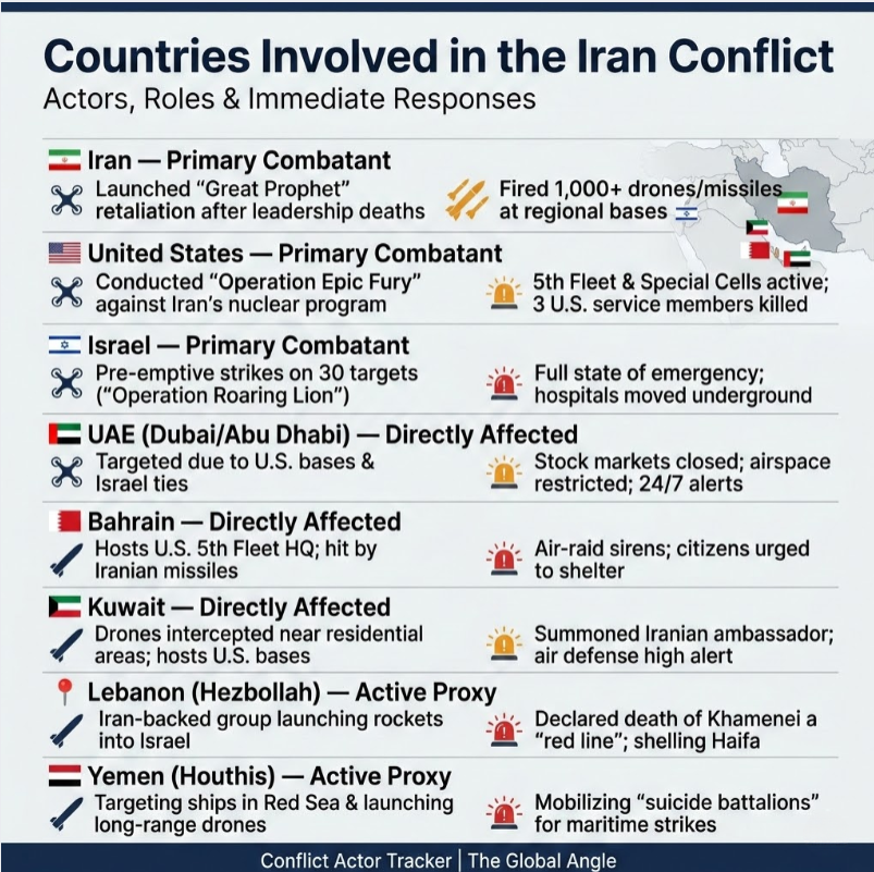 - Cyprus: In a shocking escalation, the RAF Akrotiri base (British) was hit by an Iranian Shahed drone overnight. Cyprus has officially stated it is not part of the military operation.