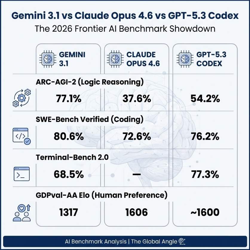 Benchmark / MetricGemini 3.1 ProClaude Opus 4.6GPT-5.3-CodexThe Strategic Takeaway