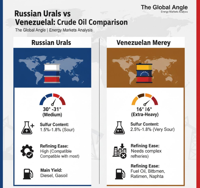 • Venezuelan Merey is significantly heavier and more “sour” than Russian Urals, requiring complex refining capabilities found primarily in private Indian facilities.