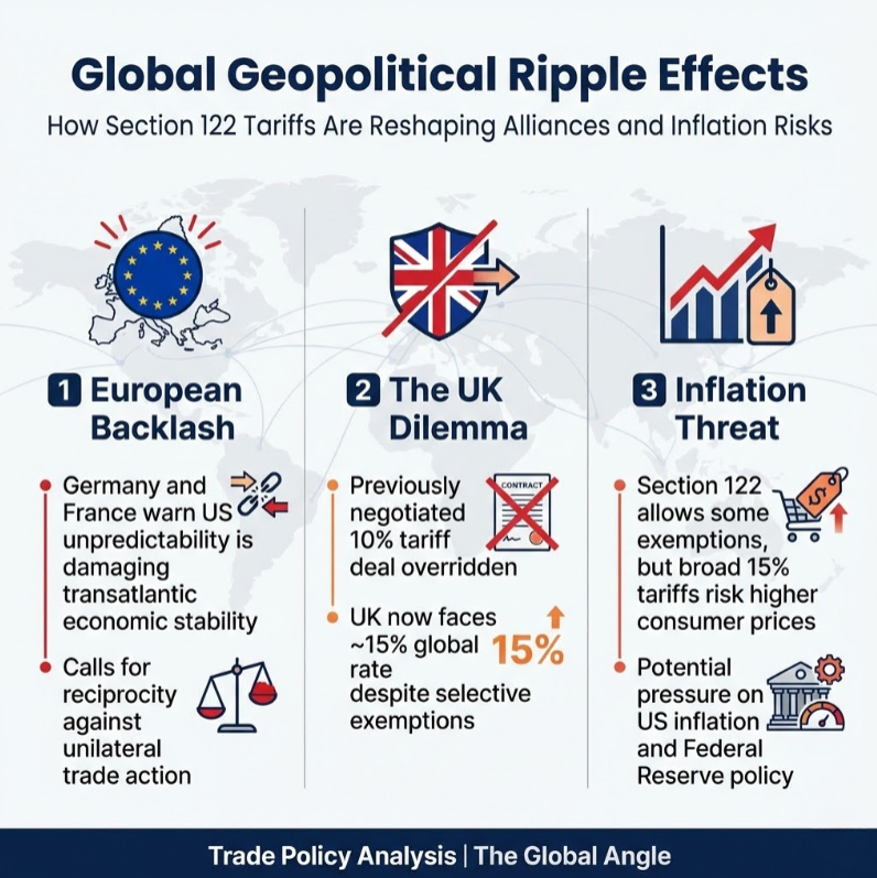 - The UK Dilemma: The UK recently negotiated a favorable 10% tariff deal with the US. The White House has now indicated that under Section 122, those deals are overridden, and the UK will face the full 15% global rate (though specific sector exemptions like aerospace remain untouched).