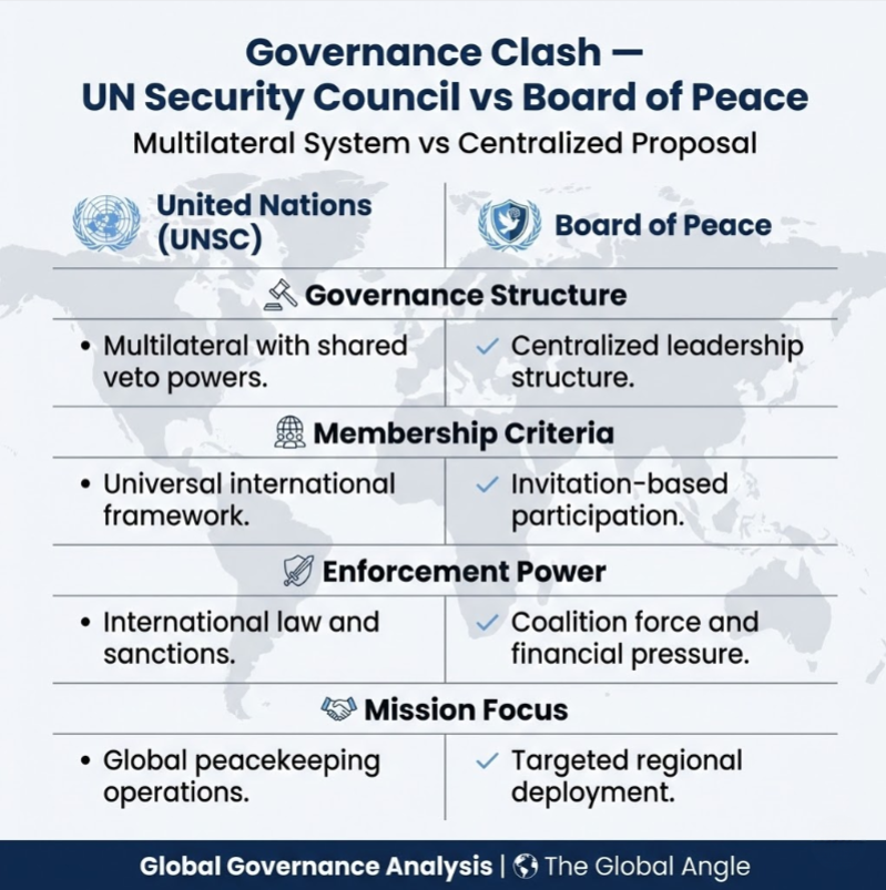When the UN Security Council makes a ruling under Chapter VII, it becomes binding international law across 193 nations. The Board of Peace has no such universal authority. It relies entirely on transactional pressure and voluntary military commitments from its specific members.