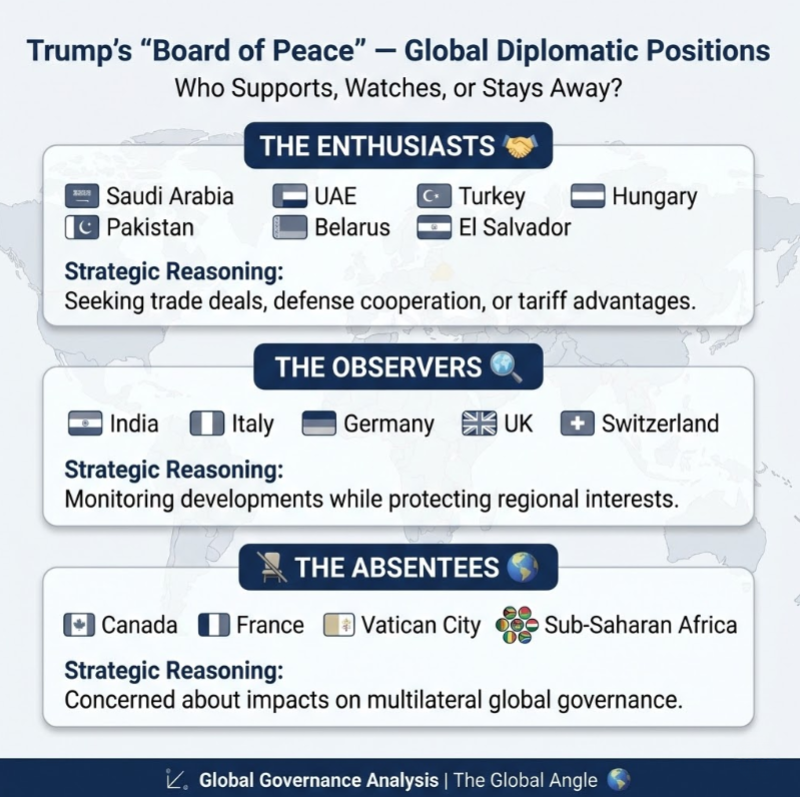 The Observers (On the Fence)India, Italy, Germany, UK, SwitzerlandRefusing to pay the $1 billion fee or legitimize Trump’s lifetime veto power, but attending to monitor developments and protect regional interests.